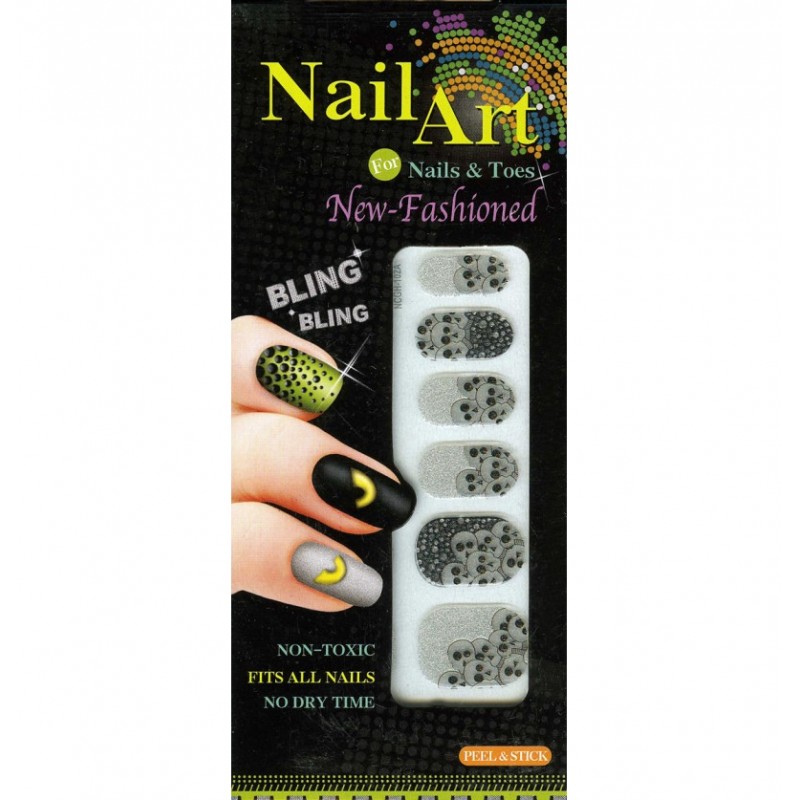 Une planche de 12 stickers d'ongles pour Halloween, version tête de mort et paillettes