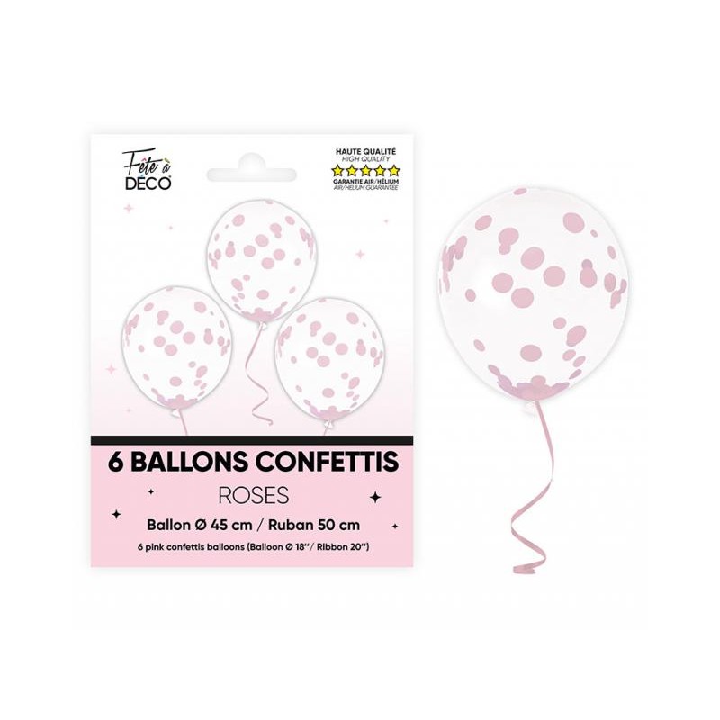 6 Ballons de baudruche à gonfler avec confettis rose poudré et 6 rubans rose de 50cm