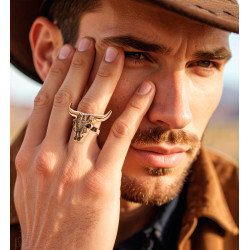Compléter votre déguisement de Cow boy avec cette bague Dorée Western représentant un crâne de Buffalo